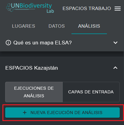 Los usuarios no pueden crear ni editar configuraciones de la herramienta ELSA. Solo pueden crear o editar ejecuciones de análisis dentro de una configuración de la herramienta ELSA. Para solicitar una configuración de la herramienta ELSA para un país específico, póngase en contacto con support@unbiodiversitylab.org.