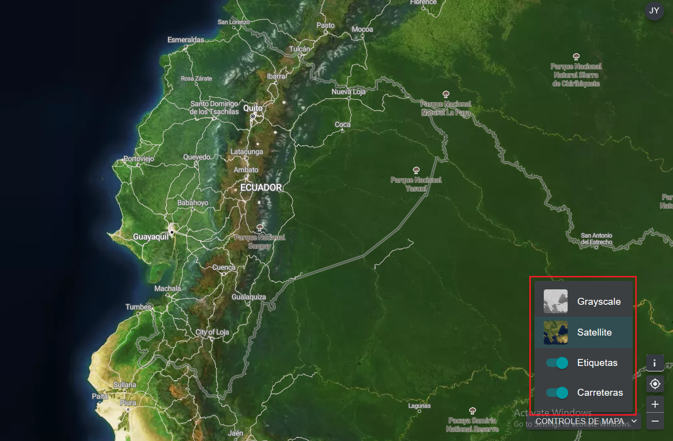 Hay varias opciones para personalizar el mapa base. Están disponibles en el icono «CONTROLES DE MAPA», en la parte inferior derecha, e incluyen: