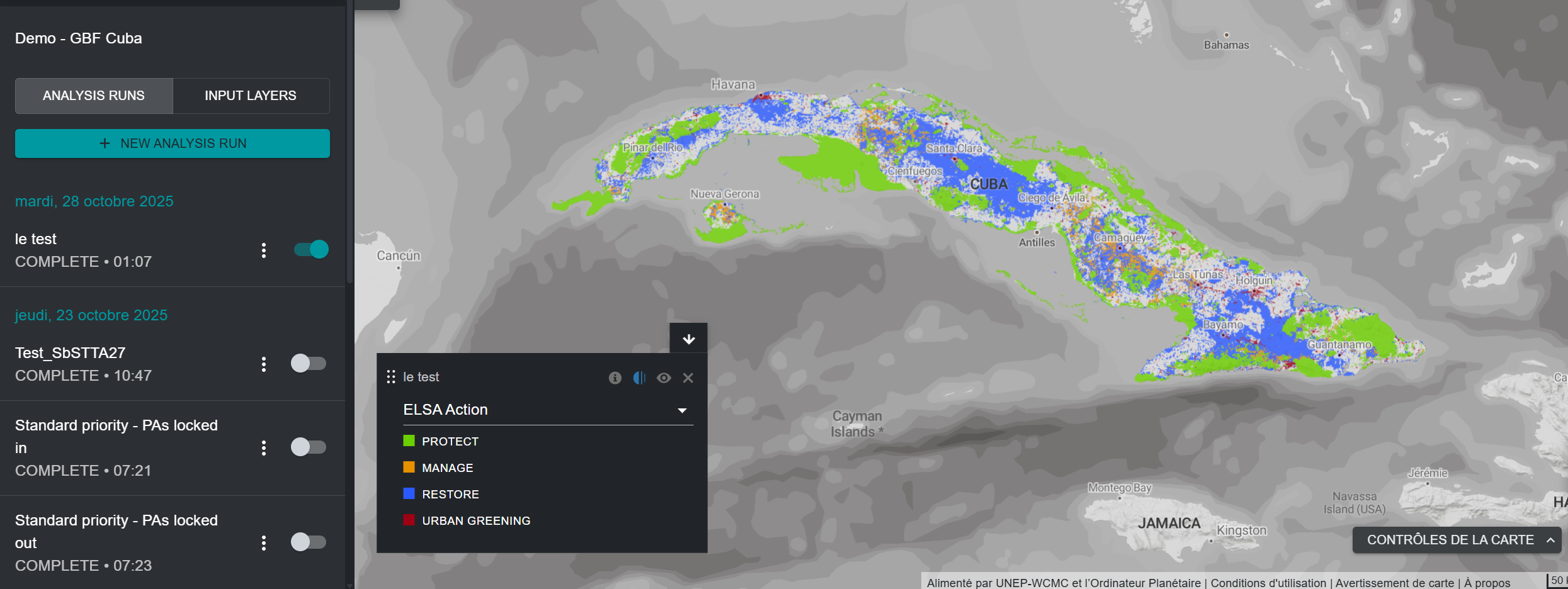 L'outil ELSA utilise le package prioritizr en arrière-plan comme outil d'optimisation spatiale pour effectuer une analyse ELSA. Prioritizr prend en charge un large éventail d'objectifs, de contraintes et de pénalités afin de créer une analyse sur mesure. Les optimisations peuvent être exécutées rapidement sur UNBL (souvent en 3 à 5 minutes). Il peut donc être utilisé pour générer et affiner des plans de conservation en temps réel lors des réunions des parties prenantes, et contribuer à un processus décisionnel plus transparent, inclusif et participatif afin d'identifier les domaines prioritaires pour soutenir la mise en œuvre des objectifs 1, 2 et 3 du KMGBF, avec des avantages connexes importants pour les objectifs 4 à 12.