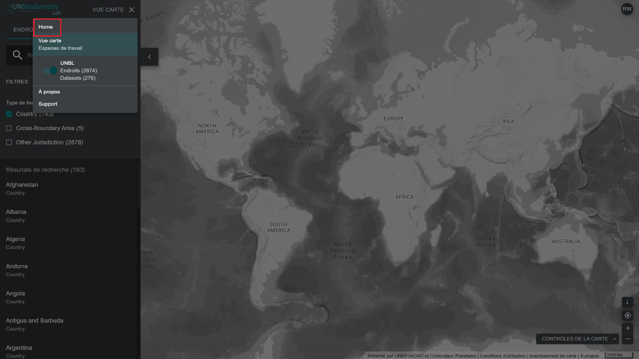 Pour revenir au site web du UN Biodiversity Lab à partir de l'application cartographique, cliquez sur VUE CARTE dans la barre d'outils de gauche, et cliquez sur ACCUEIL en haut à droite du panneau.